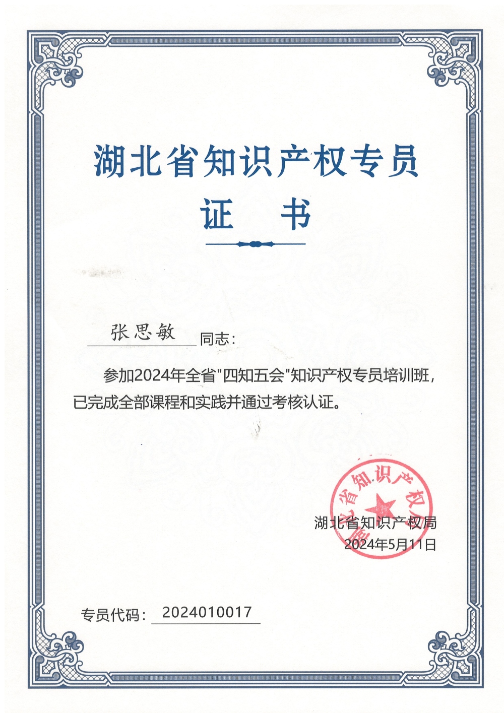 新銳科創知識產權專員榮獲湖北省知識產權局權威認證