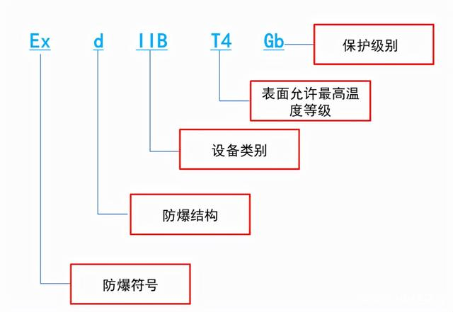 防爆符號+防爆結(jié)構(gòu)+設(shè)備類別+表面允許最高溫度等級+保護(hù)級別。