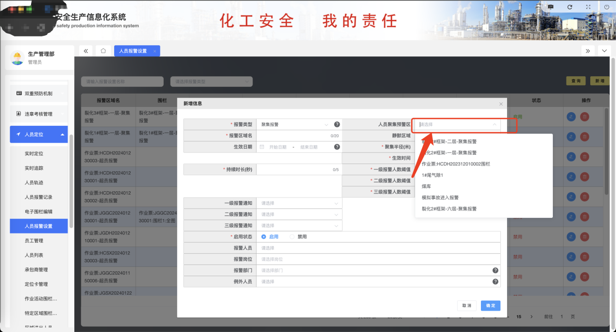 系統支持在電子地圖上自定義設置電子圍欄,可設置電子圍欄范圍,圍欄生效時間、限定人數,并且可以根據內部企業情況自由設置報警類型,例如滯留、闖入、越界、靜置、超時等報警類型。